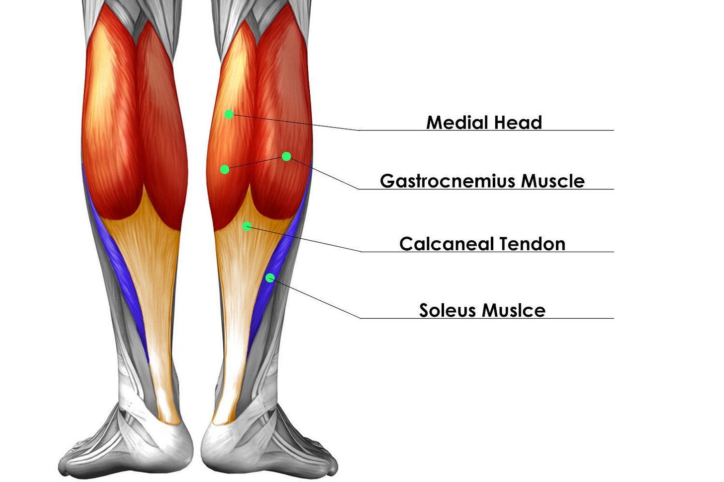 Gastrocnemius-the outer, visible calf muscle that creates the classic diamond shape when fully developed. It has two distinct heads. The gastrocnemius crosses both the knee joint and the ankle joint, which means it is most active during plantarflexion (pointing the toes) when the knee is straight. This dual-joint function is the reason standing calf raises are a key exercise for gastrocnemius development.